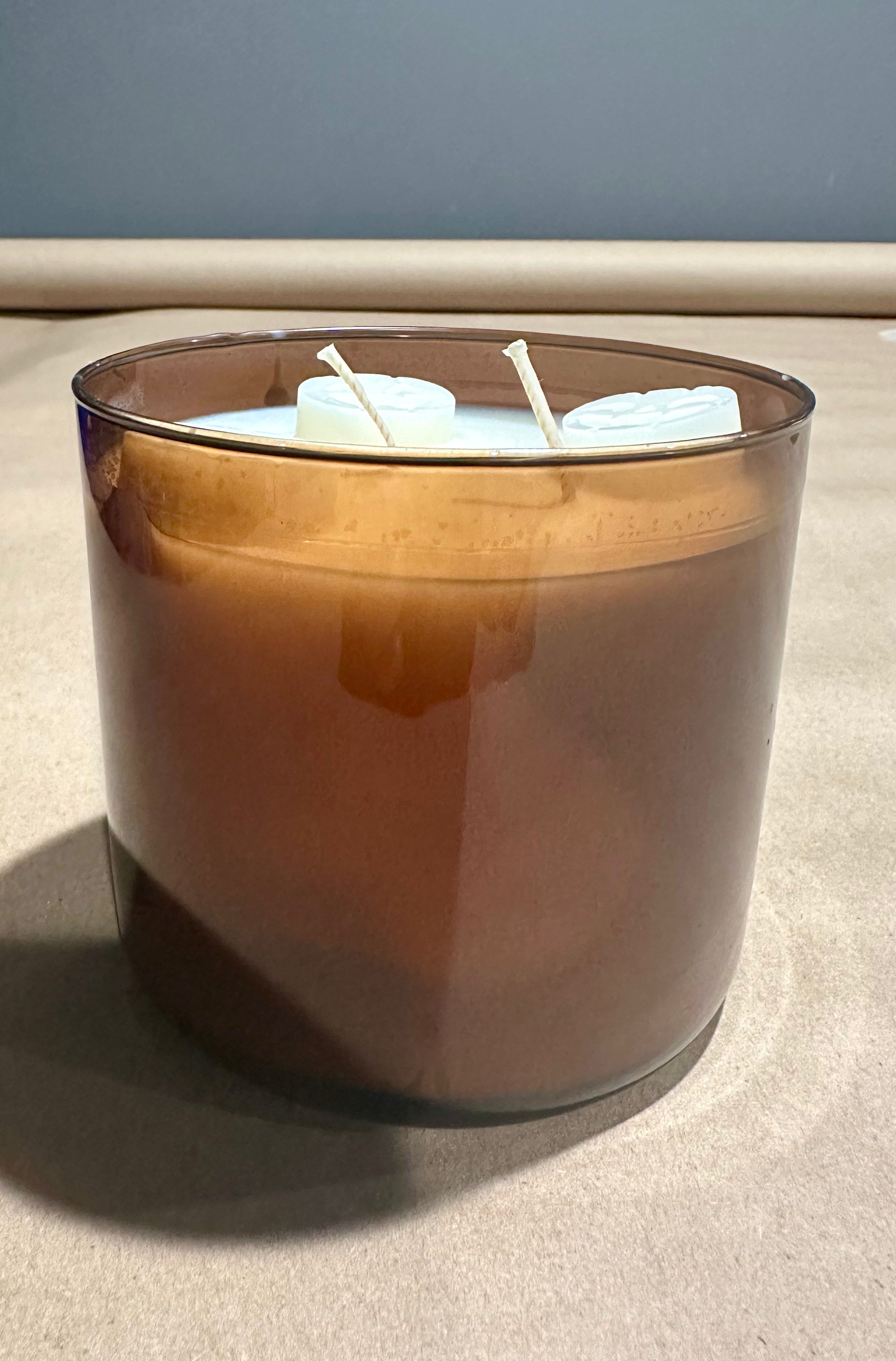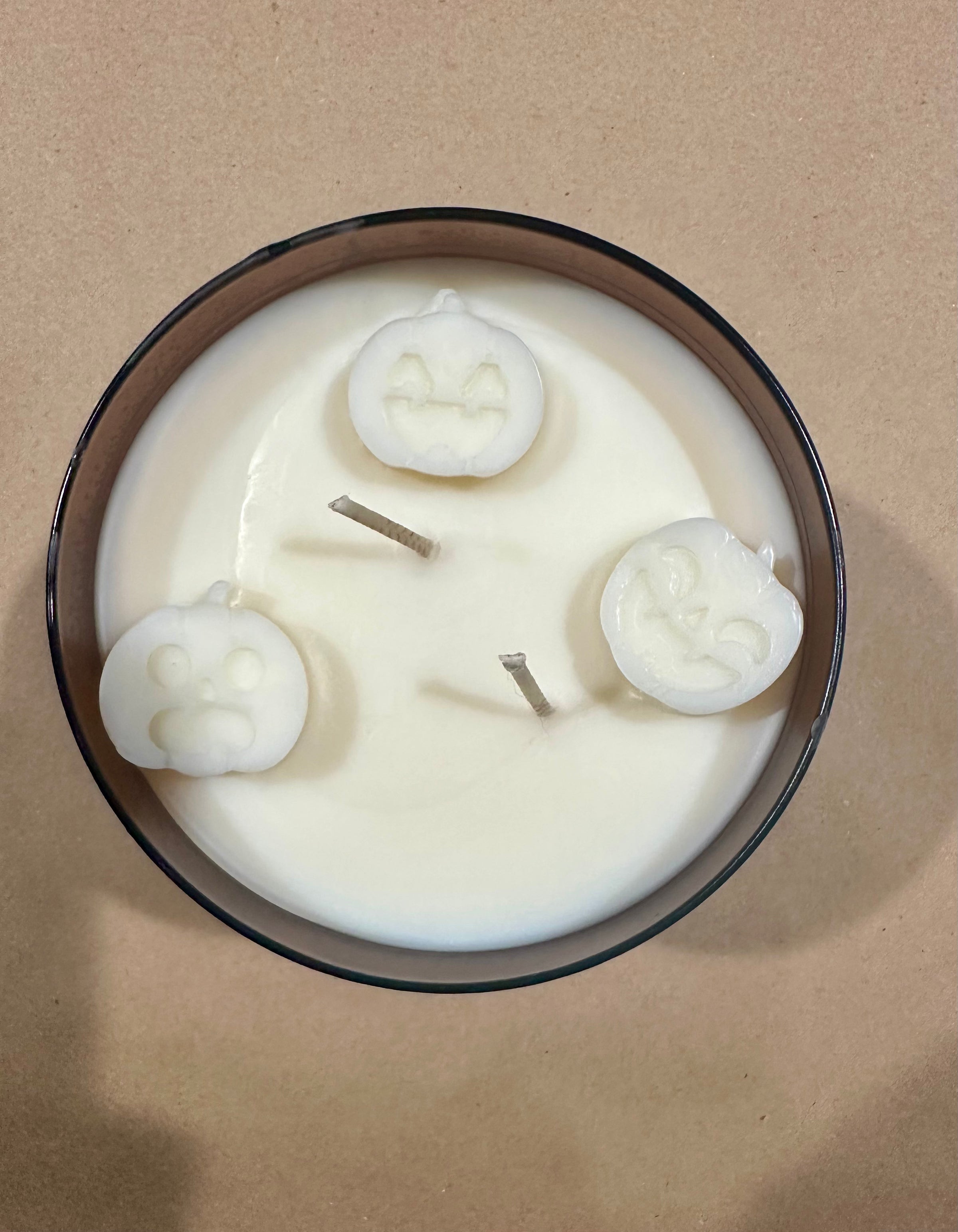 the scent you know and love in a MUCH larger jar! this double wicked amber glass jar is filled with our best selling apple cider donut fragrance and topped with cutie little jack-o-lanterns that melt with each burn!